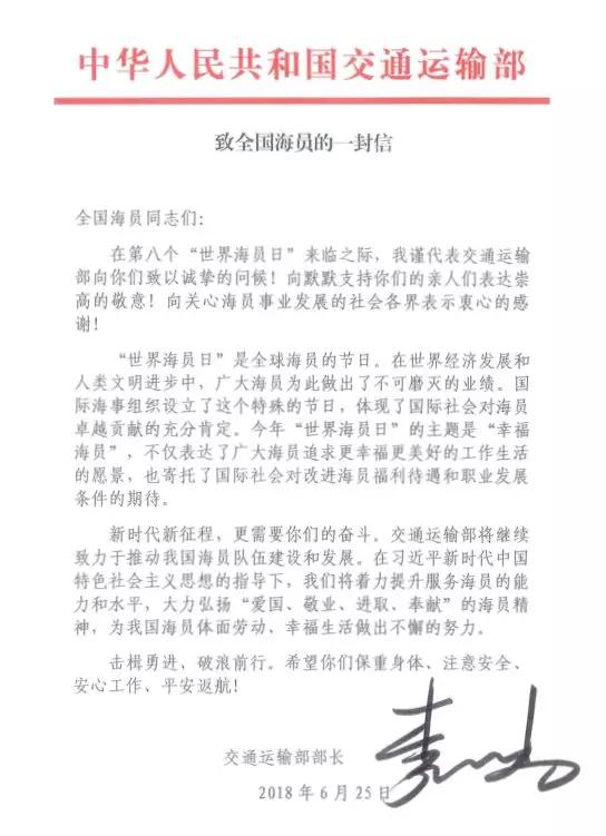 交通運(yùn)輸部部長(zhǎng)李小鵬致信慰問(wèn)全體海員。25日,中國(guó)籍民用船舶、中國(guó)航運(yùn)企業(yè)擁有或光租的非中國(guó)籍船舶將掛滿旗慶祝。在國(guó)外部分港口,中國(guó)駐地使領(lǐng)館將派員登輪慰問(wèn)在港停泊的中國(guó)海員。此外,交通運(yùn)輸部海事局與中國(guó)海員建設(shè)工會(huì)共同組織開展了大規(guī)模的“2018年媒體走近海員”新聞采訪活動(dòng),22名媒體記者分乘6艘船舶,和海員同吃同住同工作,身臨其境,現(xiàn)場(chǎng)報(bào)道,向社會(huì)展現(xiàn)當(dāng)代中國(guó)海員的風(fēng)采。
